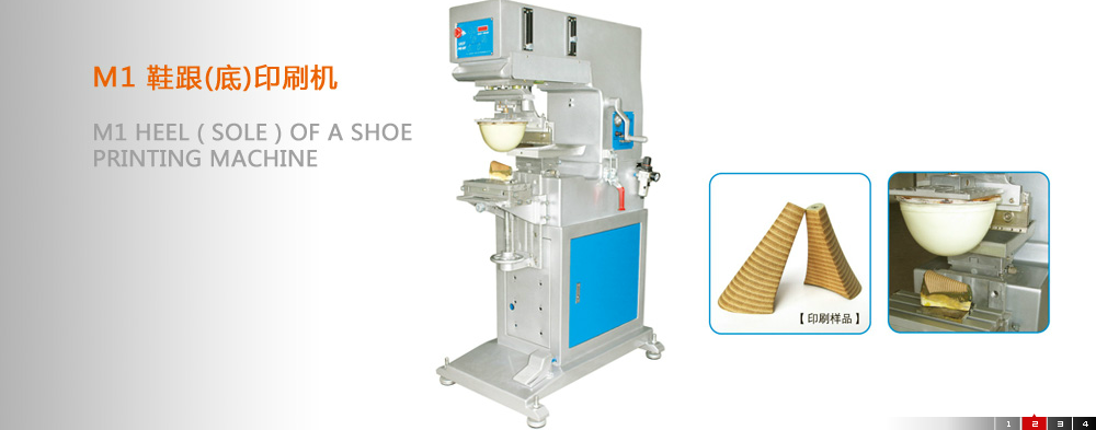 雙色帶旋轉式鞋材移印機MI/2S多功能印刷機(用途:鞋跟、鞋底仿真皮紋印刷) 我公司專業設計的鞋跟(底)印刷機,用于高跟鞋鞋跟(底)仿皮紋理印刷。 配合模具鋼板的精細網點花紋,印刷效果比滾輪印刷具有效果好,花紋清晰,操作簡便等優點……